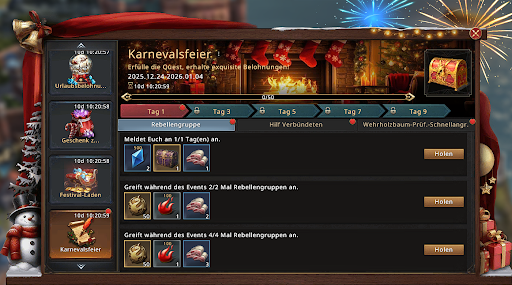 Erfüllt Aufgaben und erhaltet Ferien-Karneval-Münzen sowie weitere Belohnungen. Achtet darauf, die Aufgaben vor Ablauf der Zeit abzuschließen.