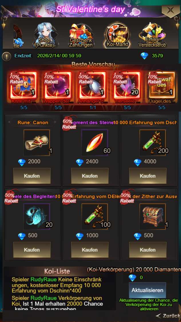 Tauscht im Koi-Markt eure Topase gegen wertvolle Gegenstände ein. Die Koi-Liste kann aktualisiert werden!