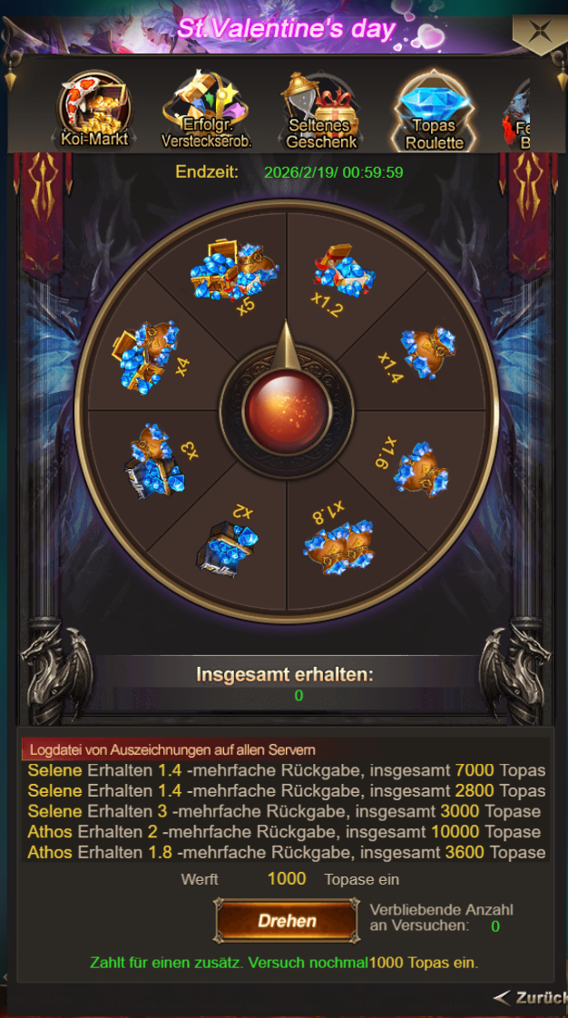 Werft Topas in die Roulette ein und erhaltet garantiert das x-fache der eingeworfenen Topase. Versucht euer Glück im Spiel!
