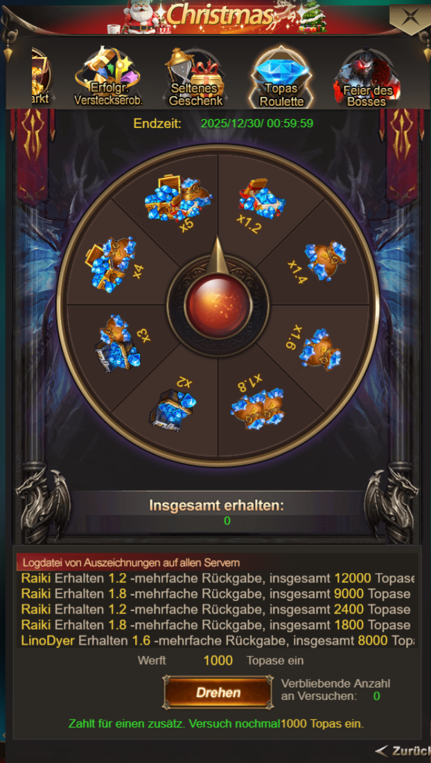 Werft Topas in die Roulette ein und erhaltet garantiert das x-fache der eingeworfenen Topase. Versucht euer Glück im Spiel!