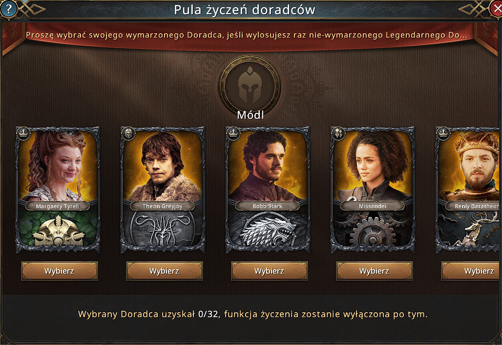 Z tej listy możesz chcieć skorzystać z konkretnego doradcy. Za każdym razem, gdy zdobędziesz legendarnego doradcę, którego nie chciałeś jako doradcy, Twój wynik życzeń wzrasta o 1. Gdy wynik życzeń osiągnie maksimum, następny legendarny doradca, którego otrzymasz, będzie twoim pożądanym.